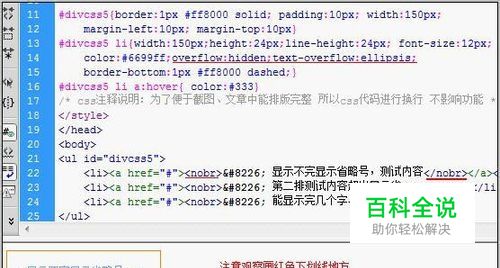 <!DOCTYPE html> <html xmlns="http://www.w3.org/1999/xhtml"> <head> <title>text-overflow案例在线演示</title> <meta http-equiv="Content-Type" content="text/html; charset=utf-8" /> <style type="text/css"> *{ padding:0; margin:0} a{ text-decoration:none;color:#6699ff} ul,li{ list-style:none; text-align:left} #divcss5{border:1px #ff8000 solid; padding:10px; width:150px; margin-left:10px; margin-top:10px} #divcss5 li{width:150px;height:24px;line-height:24px; font-size:12px; color:#6699ff;overflow:hidden;text-overflow:ellipsis; border-bottom:1px #ff8000 dashed;} #divcss5 li a:hover{ color:#333} /* css注释说明:为了便于截图、文章中能排版完整 所以css代码进行换行 不影响功能 */ </style> </head> <body> <ul id="divcss5"> <li><a href="#"><nobr>#8226; 显示不完显示省略号,测试内容</nobr></a></li> <li><a href="#"><nobr>#8226; 第二排测试内容超出显示省</nobr></a></li> <li><a href="#"><nobr>#8226; 能显示完几个字</nobr></a></li> </ul> </body> </html>