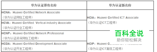 华为认证级别名称由原“HCNA、HCNP、HCIE”等9个升级为“HCIA、HCIP、HCIE”3个,其中新名称中“I”统一表示“ICT(Information and Communications Technology 信息通信技术)”。从2019年1月2日华为认证开始采用新的命名规则;从2019年2月1日开始发放新命名的证书,原证书有效期等同效力。考题,大纲暂时不出现变化