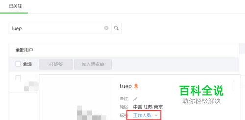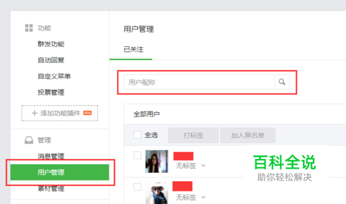 点击左侧用户管理,即可看到目前关注的所有粉丝,因为寻找不方便,所以推荐使用搜索功能