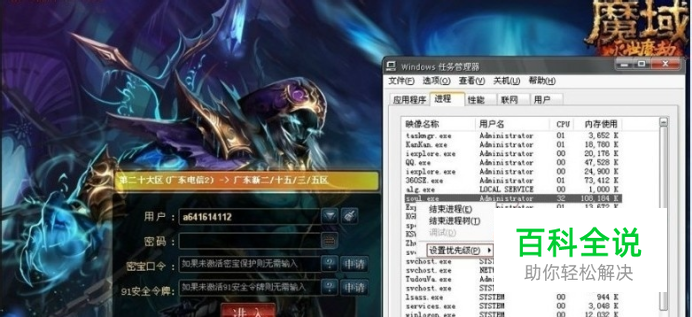 首先打开你的魔域登陆界面,填好账号密码,然后打开任务管理器,点击应用程序—魔域—右击点击转到进程。