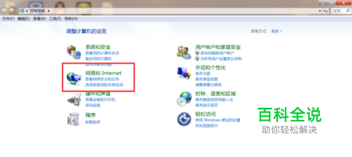 第一步打开控制面板在开始菜单栏里面就有然后就会出现如下窗口,找到窗口里的“网络和Internet”双击打开它。