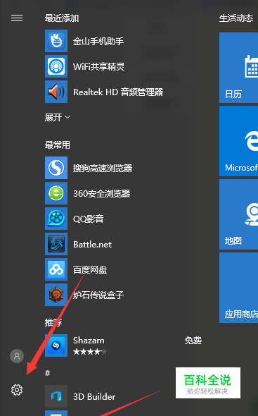 我们点击选择win10系统页面左下角如图所示的系统图标,然后点击设置