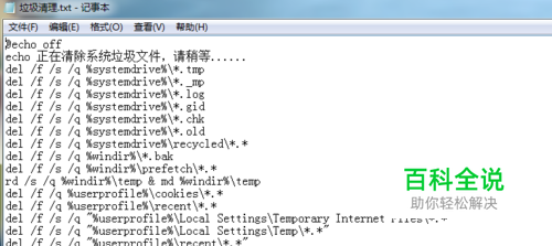 首先在你的桌面上新建一个文本文档,命名可以是“垃圾清理”,然后打开之后把下面的代码复制进去: @echo off echo 正在清除系统垃圾文件,请稍等...... del /f /s /q %systemdrive%\*.tmp del /f /s /q %systemdrive%\*._mp del /f /s /q %systemdrive%\*.log del /f /s /q %systemdrive%\*.gid del /f /s /q %systemdrive%\*.chk del /f /s /q %systemdrive%\*.old del /f /s /q %systemdrive%\recycled\*.* del /f /s /q %windir%\*.bak del /f /s /q %windir%\prefetch\*.* rd /s /q %windir%\temp & md %windir%\temp del /f /q %userprofile%\cookies\*.* del /f /q %userprofile%\recent\*.* del /f /s /q "%userprofile%\Local Settings\Temporary Internet Files\*.*" del /f /s /q "%userprofile%\Local Settings\Temp\*.*" del /f /s /q "%userprofile%\recent\*.*" echo 清除系统LJ完成! echo. & pause 把以上内容复制到文本文档里,然后保存关闭。