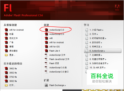 打开FLASH CS6,单击“新建”下方“ActionScript 3.0”类型 。