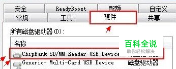 可以看到属性窗口,切换到【硬件】选项卡中,选择ChiBank SD/MM Reader USB Device,双击打开它的属性。