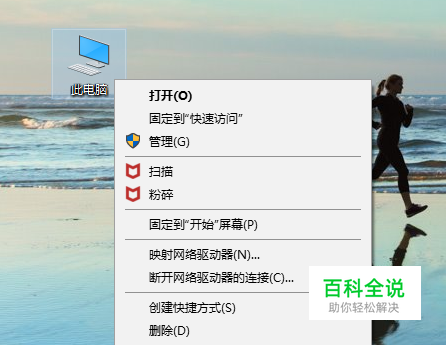 选中桌面上的“此电脑”图标,右键,点击“属性”。
