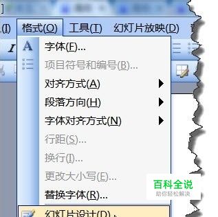 我们首先以2003为例,在”格式“菜单下选择”幻灯片设计“命令。