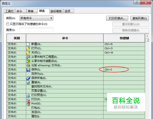键盘快捷键设置。 自定义窗口中,点击【键盘】选项卡,即可进入键盘的快捷键设置。 中间的“命令”即为我们要进行的操作,如打开、新建、保存等等。 右边的“快捷键”即对应的键盘快捷键,如“保存”对应为“Ctrl+S”,意思是我们绘图时,同时按下键盘的“Ctrl”键与“S”键,就可以完成保存当前图样的动作。 鼠标点击快捷键所在列的栏目,就可以修改命令行对应的快捷键了。 键盘快捷键这块,其实系统的设置基本可以满足常用需求了,记住常用如“保存”“打印”“撤销”等几个命令的快捷键组合就可以了。当然,追求键盘操作的用户可以根据自己需求自定义。