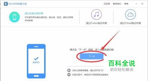 下载成功后运行该软件,在这里我们会看到三种数据恢复模式:通过设备扫描恢复,通过iTunes备份恢复,通过iCloud备份恢复。想要找回误删的微信聊天记录,一般我们选择第一种“通过设备扫描恢复”的模式,接着我们需要点击“下一步”进入到下个步骤。