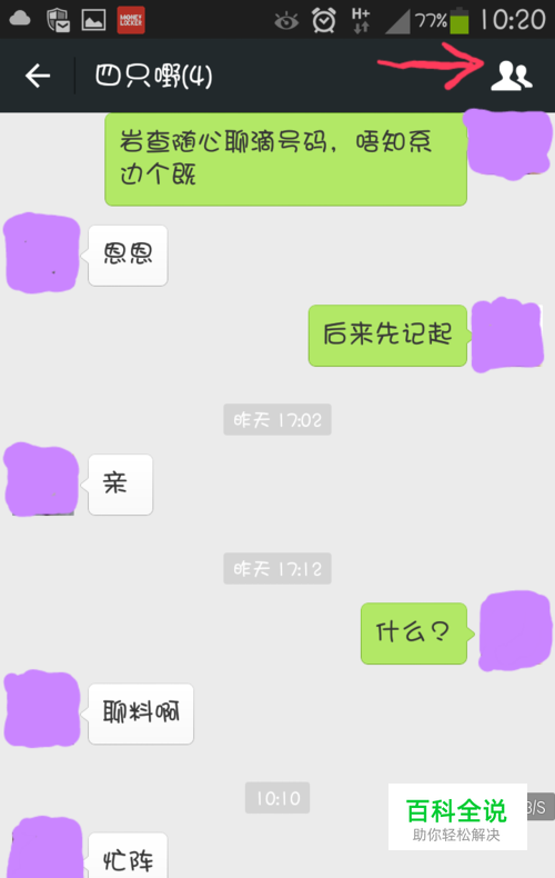 点击进入群的界面后,点击右上角的图标,如下图箭头所示。