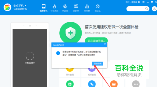 将已经损坏的手机通过USB线连接电脑,在连接过程中,会弹出一个对话框,需要安装一个360手机助手,点击继续安装按钮,就会自动的在手机里安装手机助手。
