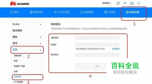 步骤三:点击 高级设置>系统>修改密码,输入当前密码、新密码,并确认新密码,点击 保存。