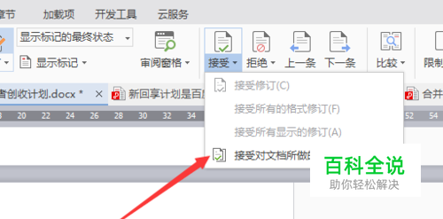 点击接受的选项之后,弹出了下拉菜单选中为 接受修订 的选项。