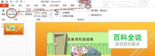 选中PPT中的视频,这时候上面就会显示“视频工具”(包括“格式”和“播放”选项卡),单击“播放”选项卡,然后单击“添加书签”按钮。