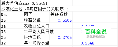 可以把结果复制到表格中便于观察和分析: 可以看到沙漠化土地和牲畜总数关联度最大为0.5506,因为牲畜的总量越多,食草量越大,对土地沙漠化的影响也越大,和年平均降水量关联度较低为0.2648.年降水量和年平均大风日数关联度最大为0.4638,同时年降水量也影响着沙漠化土地进程,和耕地面的关联度最小为0.2919.