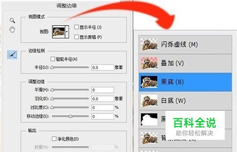 右击>调整边缘 打开【调整边缘】窗口。 视图选择:黑底。其他不用更改,在老虎的身体周边涂抹。直到老虎周围的毛已经很好的与背景区分出来。