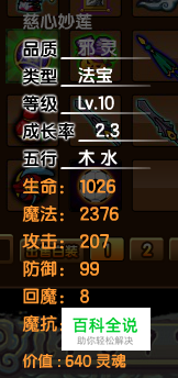 慈心妙莲法宝效果:回生,复活已出战阵亡的宠物 通过打八仙过海之一的挑战魔何仙姑可以有几率获得 注意每次宠物被打败会减少一点生命 生命达到0这个宠物消失
