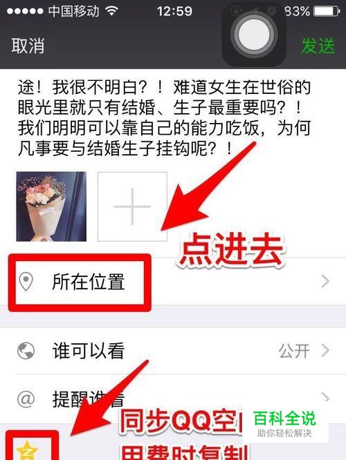 编辑好要发表的内容(只有带图片的动态才可以附带地址),点击图片下方的“所在位置”,顺便说一下点亮最下方的“qq空间”图标可以同步到qq空间哦,想要发表相同内容就不用复制粘贴啦;