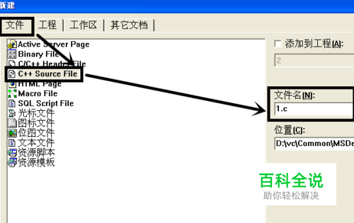 会弹出一个对话框,然后选中文件-->C++ Source File-->文件名:1.c。
