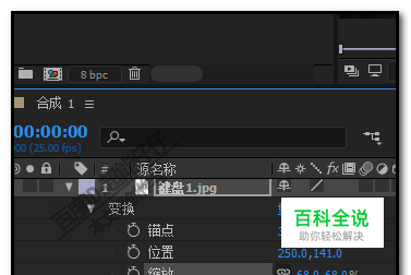 新建合成,把图片素材拖动时间线的属性面板这里来;直接生成一个图层; 本例中以一张键盘的图片为例,我们调节下图片的大小以适应合成窗口大小。
