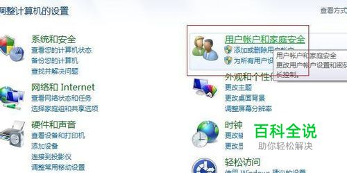 打开了调整计算机的设置,找到用户账户和家庭安全选项