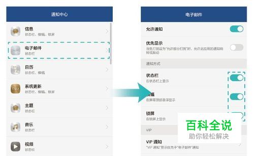 点击一个应用程序设置其通知权限。如点击电子邮件,打开状态栏、横幅、锁屏开关,在您收到新邮件时,通知将分别显示在状态栏、桌面和锁屏界面。