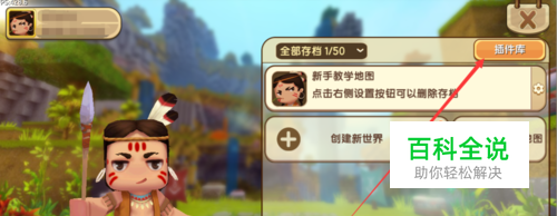 进入到迷你世界游戏,然后【开始游戏】,然后选择红色箭头处的【插件库】。