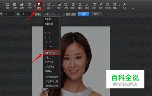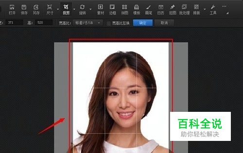 将你要制作成一寸照片的相片放入光影魔术手中,点击“裁剪”功能,在宽高比下拉框中选择“标准一寸/R”规格,然后裁切,再确定即可,如下图。