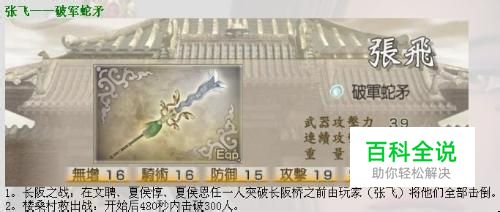张飞:武器:(破军蛇矛)战场:(长坂之战:蜀军)条件:先迅速击败附近的敌将文聘,引发“长坂桥仁王立”剧情,然后迅速击败夏侯惇和夏侯恩。成功后会有“贵重物品”发现提示。
