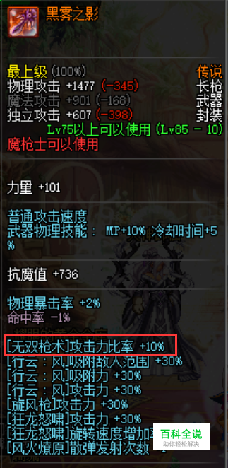 武器推荐“黑雾之影”(【无双枪术】攻击力比率+10%),还可以选择以下装备“冰闪” (技能Lv +3)、“竹影”(技能Lv +3)。