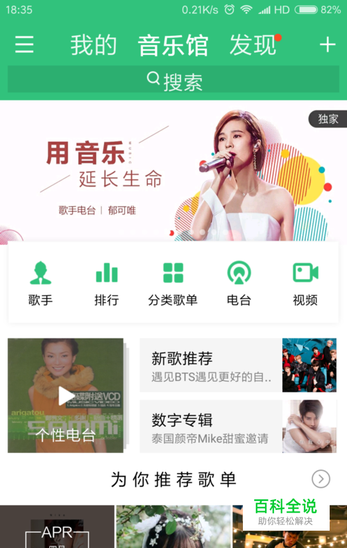 . 我们打开移动版QQ音乐之后,我们会来到音乐馆的页面,在这个页面里我们可以浏览到新出的音乐或者QQ音乐每天为你推荐的歌曲 。 .