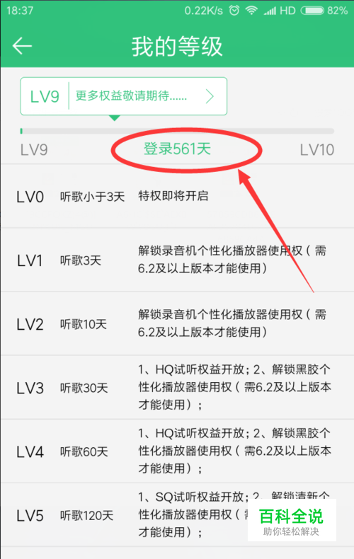 . 我们来到我的等级页面之后,我们就会看到自己在QQ音乐里面的总登录天数,还可以查看距离下一个等级还差多少天 。 .