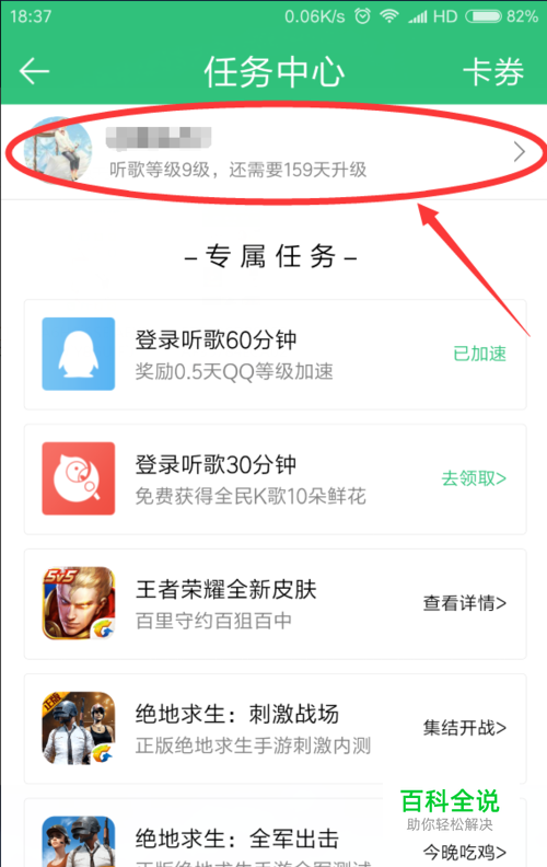 . 然后,我们在任务中心页面可以查看自己每天听歌的任务进程,我们在任务中心找到‘我的等级 ’按钮 ,点击进入我的等级页面 。 .