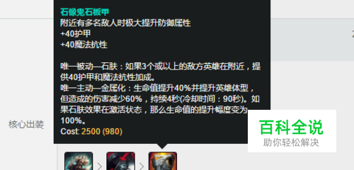 石像鬼石板甲 皇子在上单位置上还是坦克属性的,石像鬼石板甲起到一个主动血手的作用,可以在团战开启时,开启石像鬼石板甲吸收一波伤害。