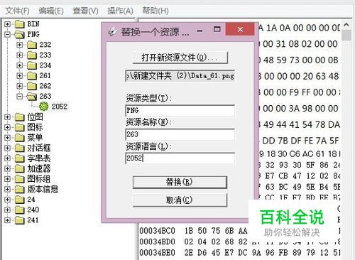 参照得到的PNG文件,制作好同分辨率的PNG。 回到ResHacker界面,右键对应的资源结点,右键“替换资源”,得到如图所示的对话框,输入和该资源结点一致的参数(注意不要输错了),这里以 PNG-263-2052示例。如图所示。 其他同。 用记事本打开导出的rc文件可以知道对应的结点位置。