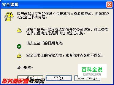 在IE浏览器中输入Web远程管理服务器的地址https://10.115.223.8:8098,其中的8098是该服务使用的端口号。打开“安全警报”对话框,单击“是”按钮继续,如图2008122404所示。 图2008122404 安全警报