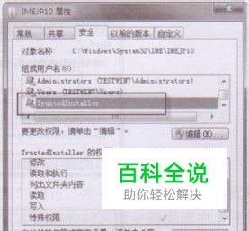 打开“IMEJP10”文件夹的属性对话框,切换到“安全”选项卡,在“组或用户名”列表框中可以看到一个比较古怪的账户“Trustedlnstaller”,如图2所示。