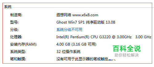 单击;“计算机”属性后,我们可以看到CPU和内存的信息