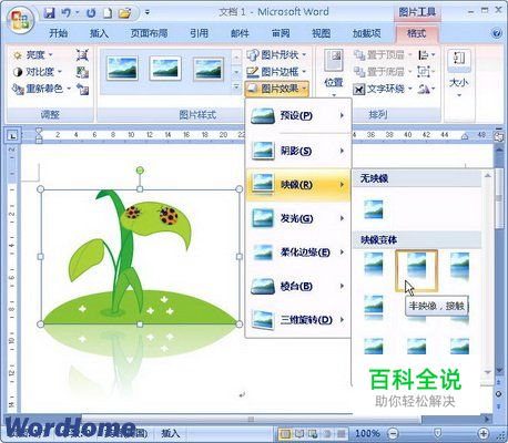 第2步,在“图片工具”功能区的“格式”选项卡中,单击“图片样式”分组中的“图片效果”按钮。选择“映像”选项,并在打开的映像列表中选择需要的映像效果即可,如图2009032110所示。图2009032110 设置Word2007剪贴画映像效果