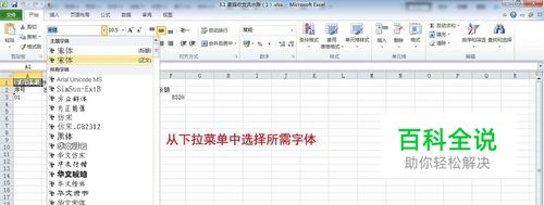 一、设置字体与字号 (1)选中需要修改字体字号的单元格,在“开始”|“字体组”中选单击字体调节文本框的下拉菜单,选择需要的字体。单击字号调节文本框的下拉菜单,选择所需字号大小,如图所示。