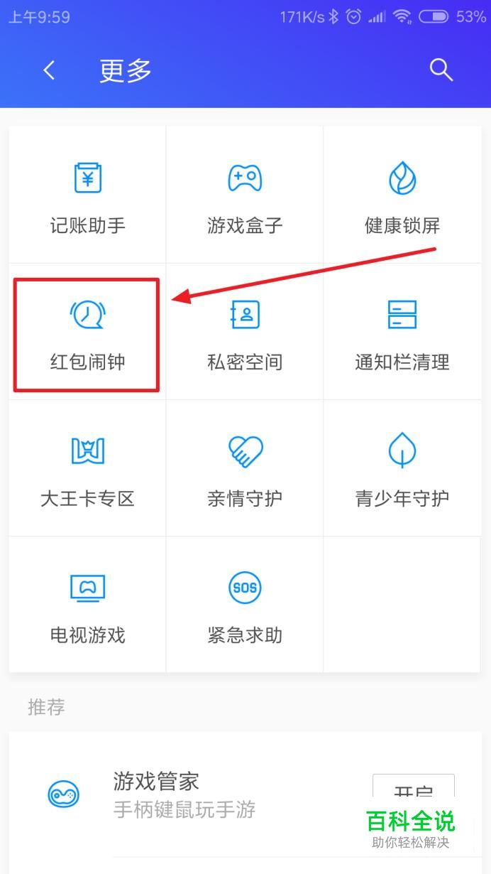 腾讯“手机管家”是一个非常实用的多功能杀毒软件,它可以帮你保护手机安全,升级软件,清理垃圾,连接WiFi . . 等等 。功能是很多的,其中有一个功能是我们现在要讲的红包闹钟功能。它有家人有诈骗风险提示,给家人充值提示,大网卡流量提示,红包闹钟,手机加速,手机风险提示,还款提示,游戏福利提示,快递提示的功能。