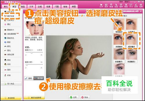 在“美图秀秀”软件下打开待处理的照片,进入“美容”菜单下,选择“磨皮祛痘”功能----超级磨皮,之后再用橡皮擦擦去五官和头发,让皮肤光滑质感的同时保留细节。
