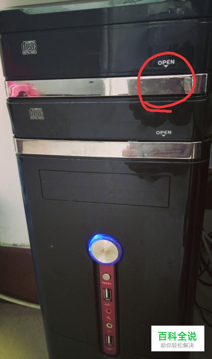 找到主机上光驱按钮,按下“open”,打开光驱。