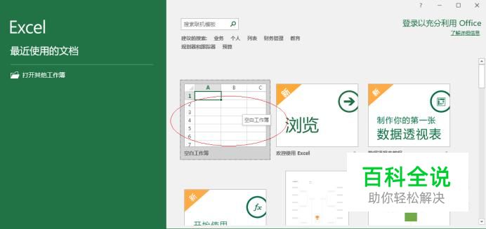启动Excel 2016电子表格应用程序,如图所示点击界面右侧新建空白工作簿。