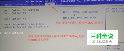电脑开机按快捷键【F2】进入bios设置界面,通过方向键“→”移动到BOOT选项页,再通过方向键“↓”移动至UEFI Setting选项,按回车键进入,如下图所示: