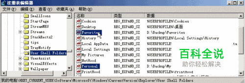 点“开始”→“运行”,在运行框里输入“regedit",回车后,在注册表里找到HKEY_CURRENT_USER\Software\Microsoft\Windows\CurrentVersion\Explorer\User Shell Folders键,然后在窗口右边找(如下图):㈠找到“Favorites",回车将值修改为”D:\Backup\Favorites";㈡找到“Personal",回车将值修改为”D:\Backup\My Documents”。修改完后,按F5刷新注册表,即可看到效果。