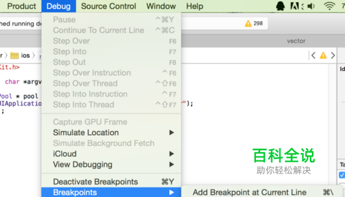 创建异常断点 依次选择“Debug”》“Breakpoints”》“Create Execption Breakpoint”