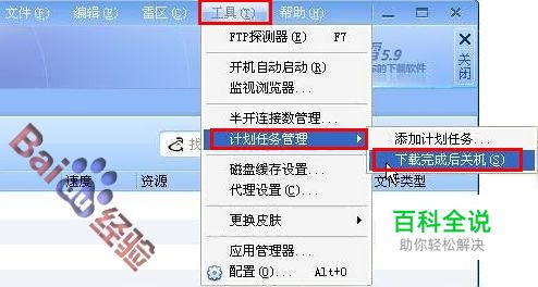 迅雷5.9 在迅雷5.9主窗口中选中“工具”-----“计划任务管理”-----“下载完成后关机”选项。