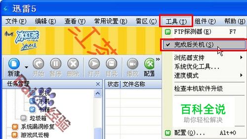 迅雷5.8 在迅雷5.8主窗口中勾选“工具”-----“完成后关机”选项。