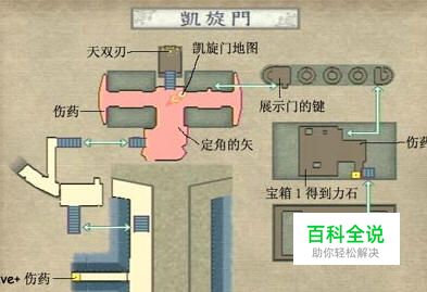 寺院的地图 →回到教堂大厅有黑雾包围着的雕像处按照灯亮的数目1.2.3.4的顺序吸收黑雾 →到鹰的雕像处得到“空牙刀” →再次回到绿色封印之门即可进入 →这个断恫回廊的地图东南处得到“绳梯” →东北处开宝箱=8上 12上 11右 10右 6下得到“身代的像” →来到地图西北处的悬壁使用“绳梯” →得到“金之骷髅头” →回到断恫回廊尽头使用 →干掉敌人后地面得到“时空研究书 三”啊儿可以得到“雷之矢” →进入传送点